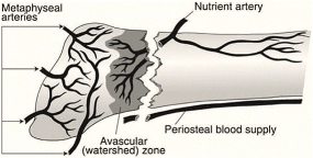 There is considerable research regarding fractures of the fifth metatarsal, which may be due to the increased risk of poor healing (delayed healing, nonunion, or malunion) associated with these fractures. One reason this occurs is due to the unique blood supply surrounding the base of the fifth metatarsal. Blood supply at the base is derived from 3 sources: the nutrient artery, the metaphyseal artery, and the periosteal artery. A watershed area (area of decreased blood supply) exists between the blood supply of the metaphyseal artery perforators and the retrograde branches of the nutrient artery. (2) This watershed area is known to be the most likely location of poor fracture healing that occurs at the base of the fifth. (7)