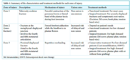 There is no one treatment option for all fractures to the base of the fifth metatarsal, and knowing this, reinforces the crucial nature of correctly diagnosing and classifying metatarsal fractures in order to make optimal treatment and individualized management decisions.